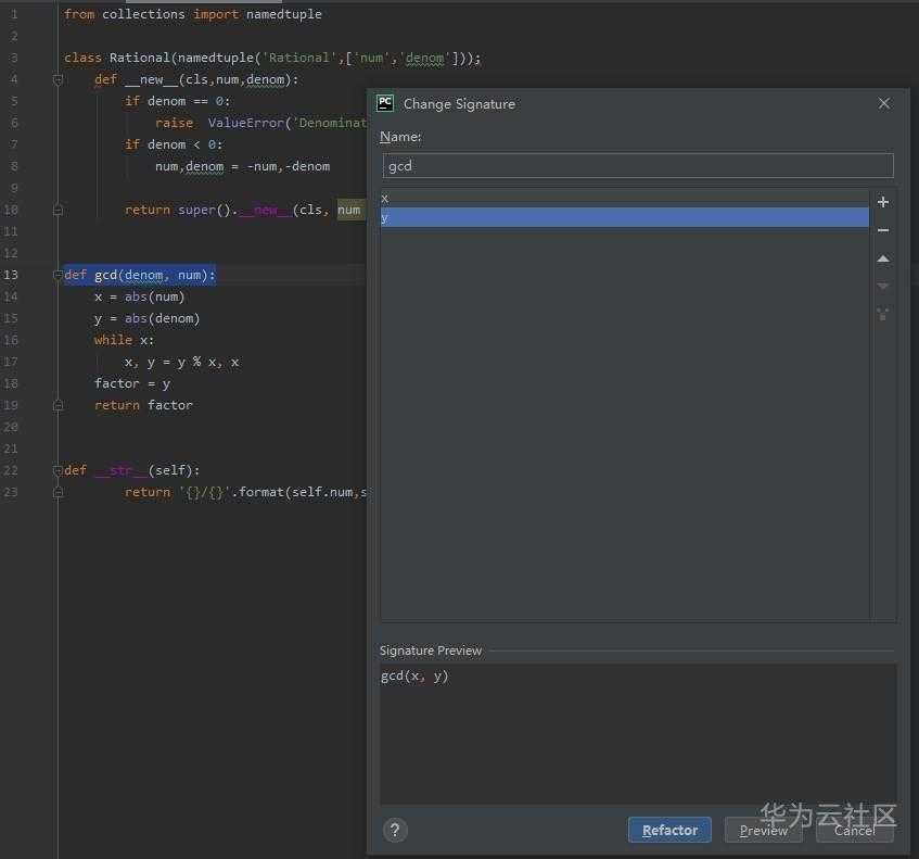 使用使用Change Signature更改参数名称。选中方法声明行,然后按Ctrl+F6。在打开的dialog box中,分别将参数denom和num重命名为x和y,然后单击图标节点upLevel以更改参数的顺序。