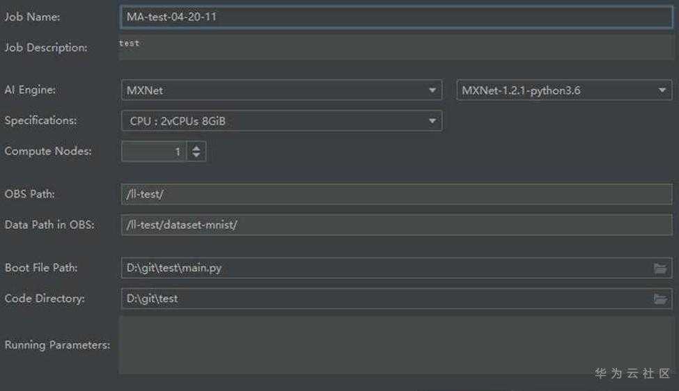 填写参数,可以参考ModelArts训练模型时填写的参数: