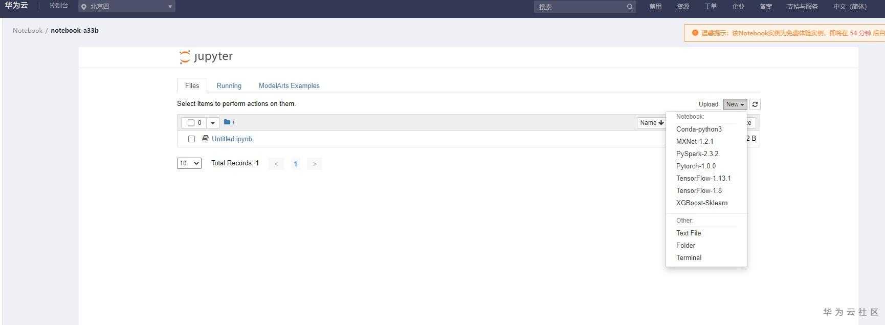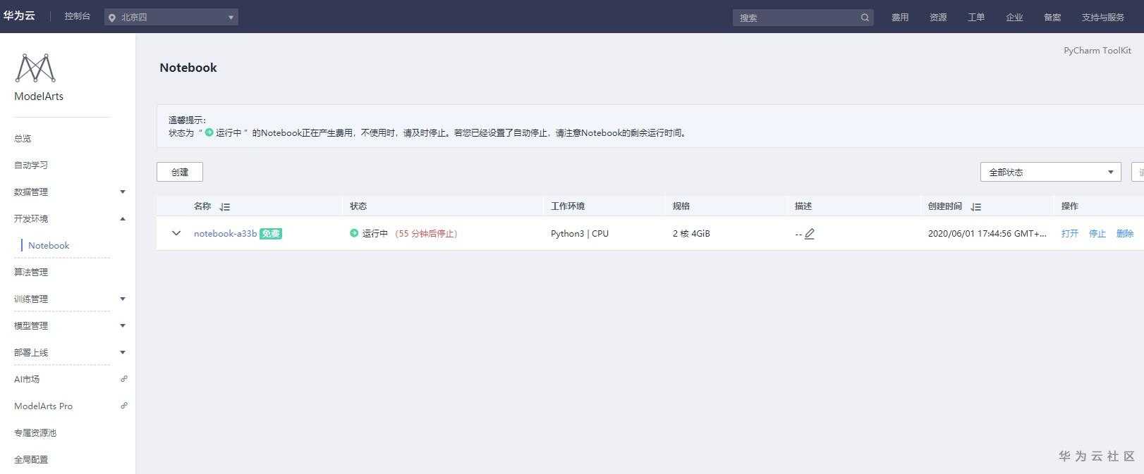 我们具体看看Jupyter如何工作的?首先在公有云上创建一个Notebook,点击“打开”按钮,如下图所示: