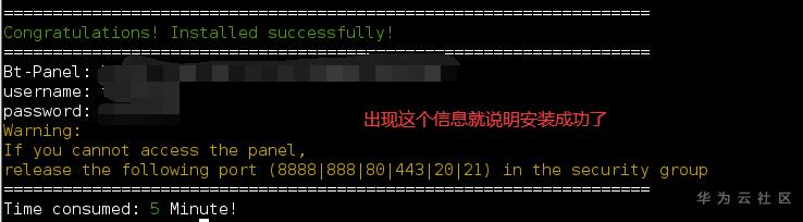 3. 我们耐心等待一会儿,等宝塔面板自动安装完成(中间若出现是否安装*Y/N?时,我们只需要输入y就行了)。