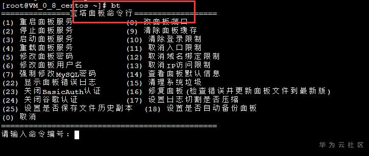 安装完成后,我们接着再命令行输入bt,这个时候就会显示面板的使用帮助菜单选项。