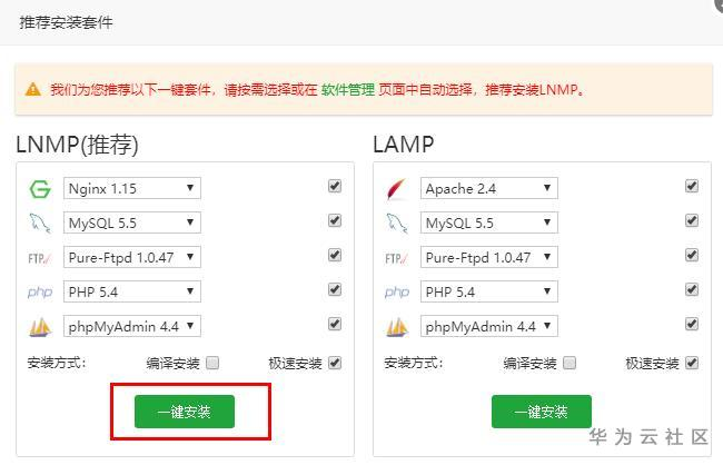 5.我们把登录地址复制到浏览器打开,输入用户名和密码,进入到宝塔面板的后台管理页面。一般来说, 首次登陆进来面板后,会自动推荐你安装环境套件,这里有两种选择,第一种是LNMP套件,第二种是LAMP套件 。如图(建议选择一键安装LNMP)