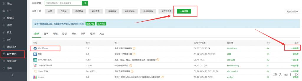 7.下面我们开始来一键部署WordPress建站程序,(提示:如果前面你没有安装LNMP环境或者LAMP环境,也不要着急,我们可以在软件搜索步骤5列出的几个套件手动安装),点击面板左侧“软件商店”,然后找到WordPress,选择一键部署。