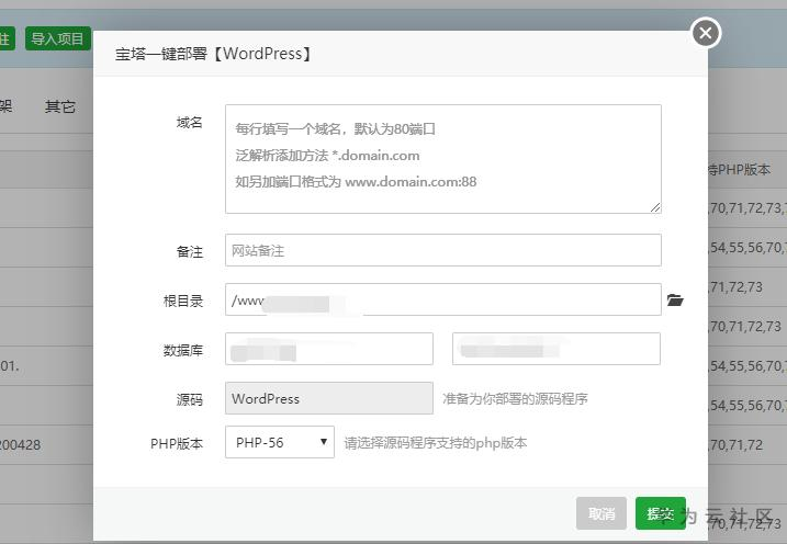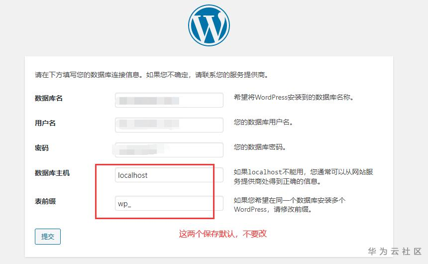 8.输入你的网站信息,即你的域名。另外,为了避免出现不可知的错误,新手建议不要修改默认创建的数据库名和命令,自己把它存储好就行。(当点击提交后,系统会自动列出数据库名和密码以及网站地址,请保存好这些信息,后面进入WordPress安装需要填写)