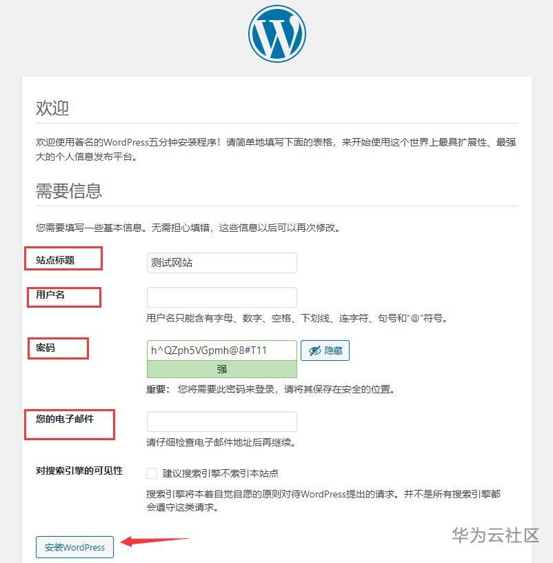 10. 安装完成后,登陆你的Wordpress管理后台。(后台登陆地址为:你的网址或ip/wp-admin)