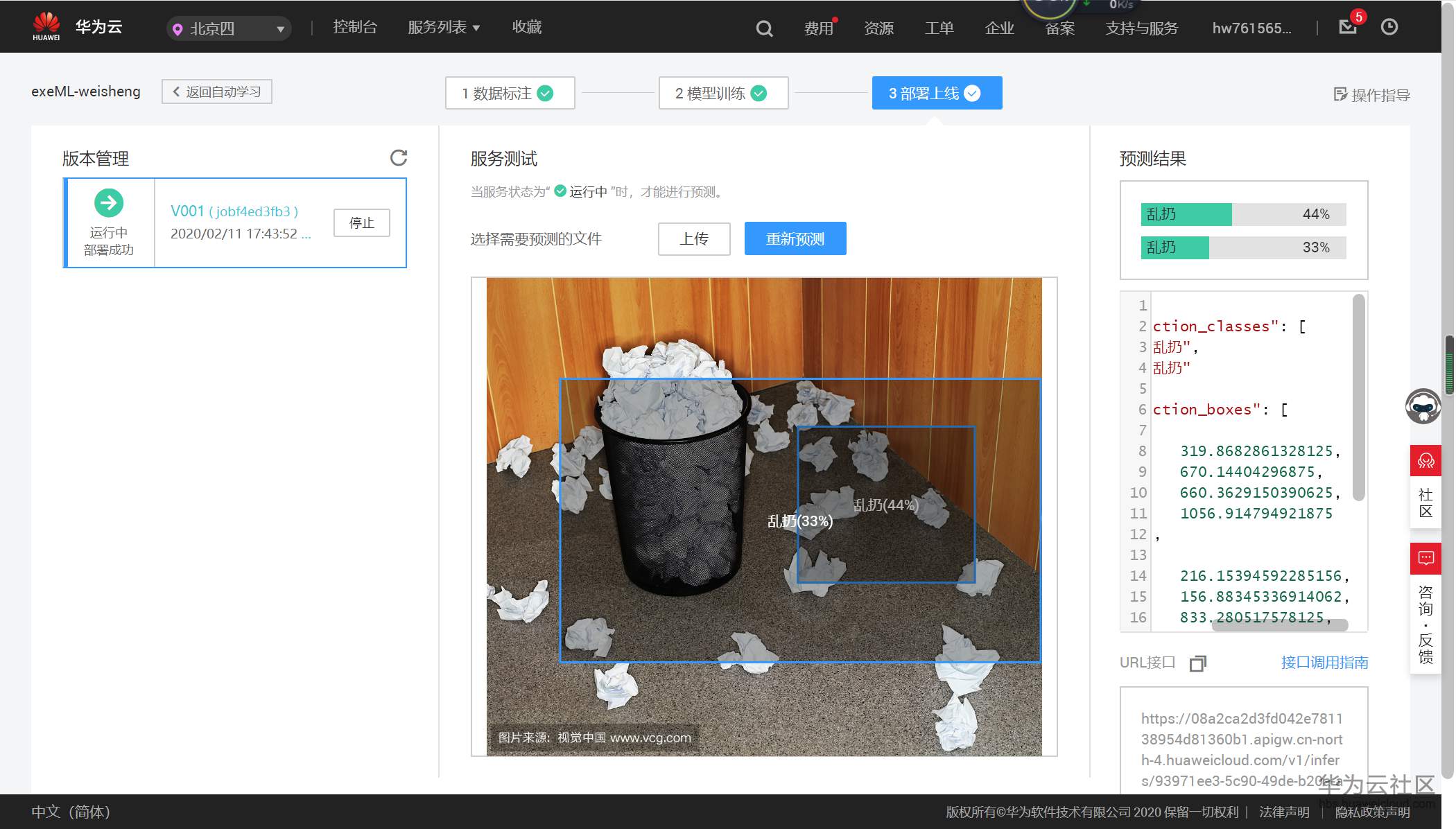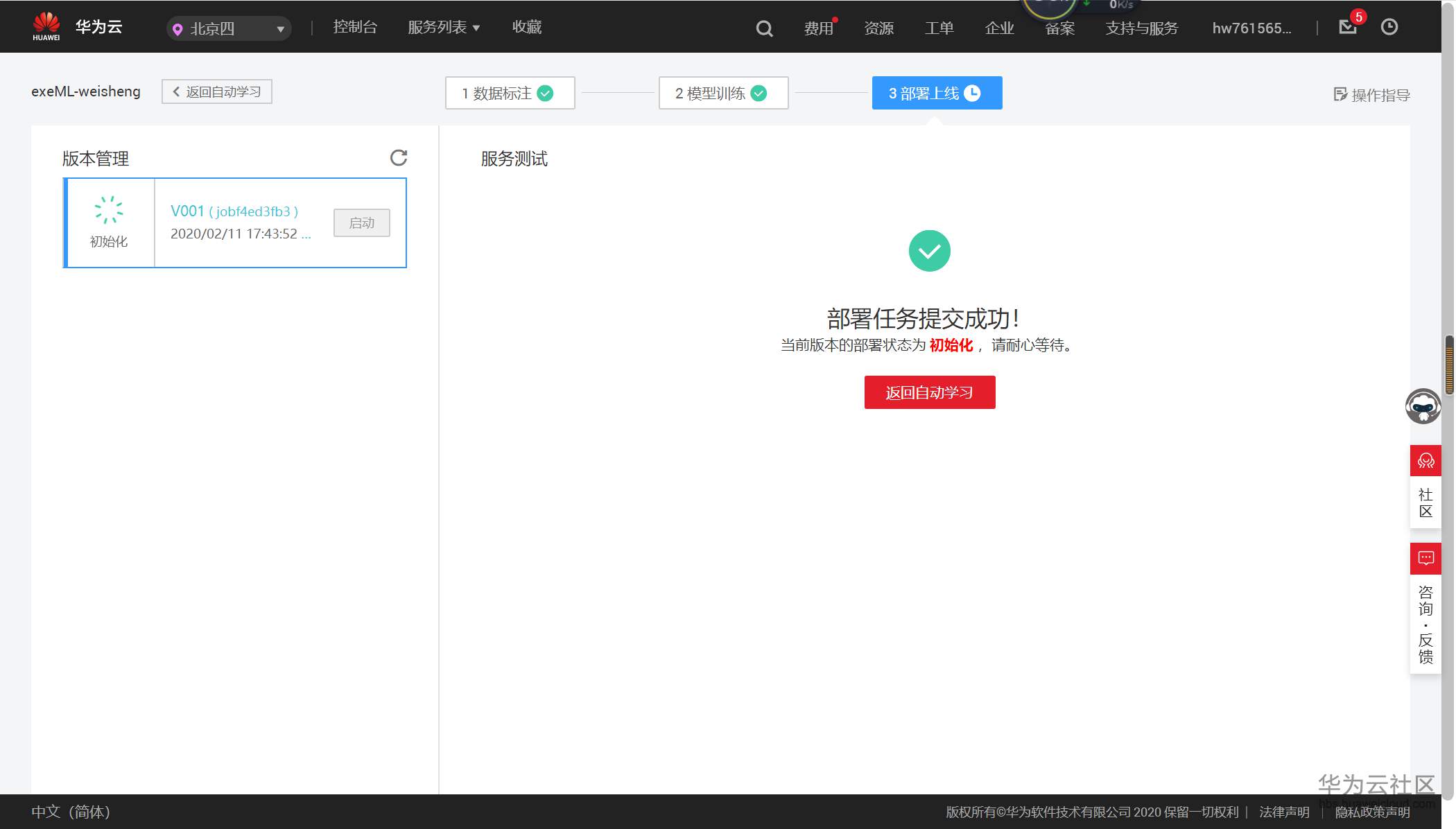 (3)训练成功后进行一键线上部署上线,得出模型准确率为88%以及一些相关数值。