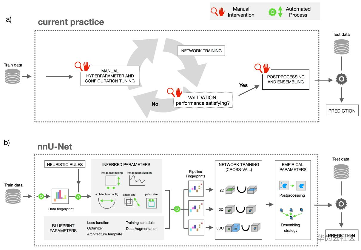 图2 (a)典型的深度学习分割网络模型的处理流程(b)nnU-net的全自动化处理流程[1]