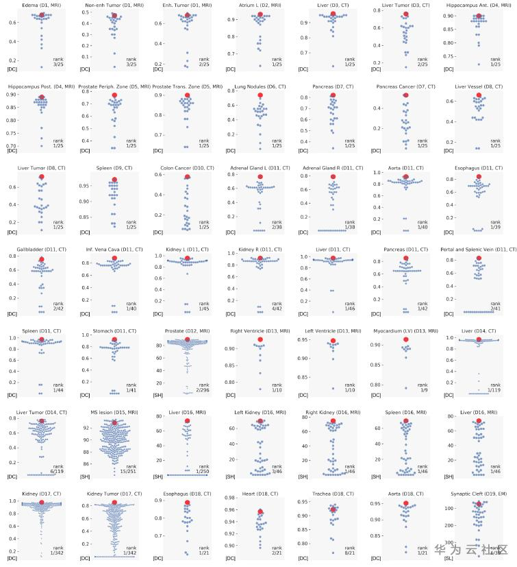 图4 在49个器官分割任务中,nnU-Net均取得了名列前茅的分割性能(红点是nnU-Net,蓝点是其他方法的分割性能)[1]