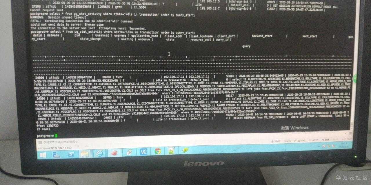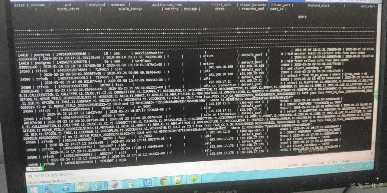 这里发现有语句可以用开始的时间可以和dn上的作业开始时间对应上,并且语句完全一样,只是此时的queryid已经被置为0(因此一开始在cn没有查到),并且状态是idel in transaction,这个状态代表事务未提交。