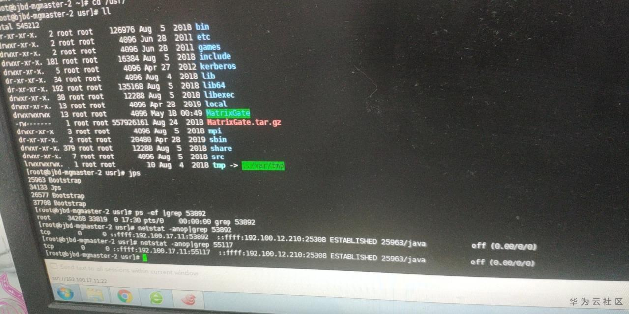 当前图片中可以看到,对端是192.100.12.6:50079,此时可以ssh到对端,查看是否是cn,并且用同样命令: