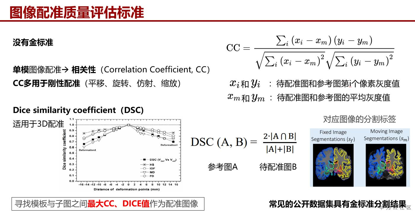 对于真实世界的图像来说,图像配准常常是没有金标准的。对于刚性配准,可以使用相关性(CC)作为评价指标。对于柔性配准,可以使用Dice作为评价指标(前提是数据集中有分割标注)。