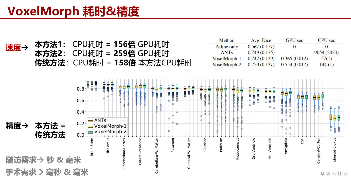 VoxelMorph在分割性能上并没有显著提高,但在耗时上让柔性配准进入秒级时代[2]。