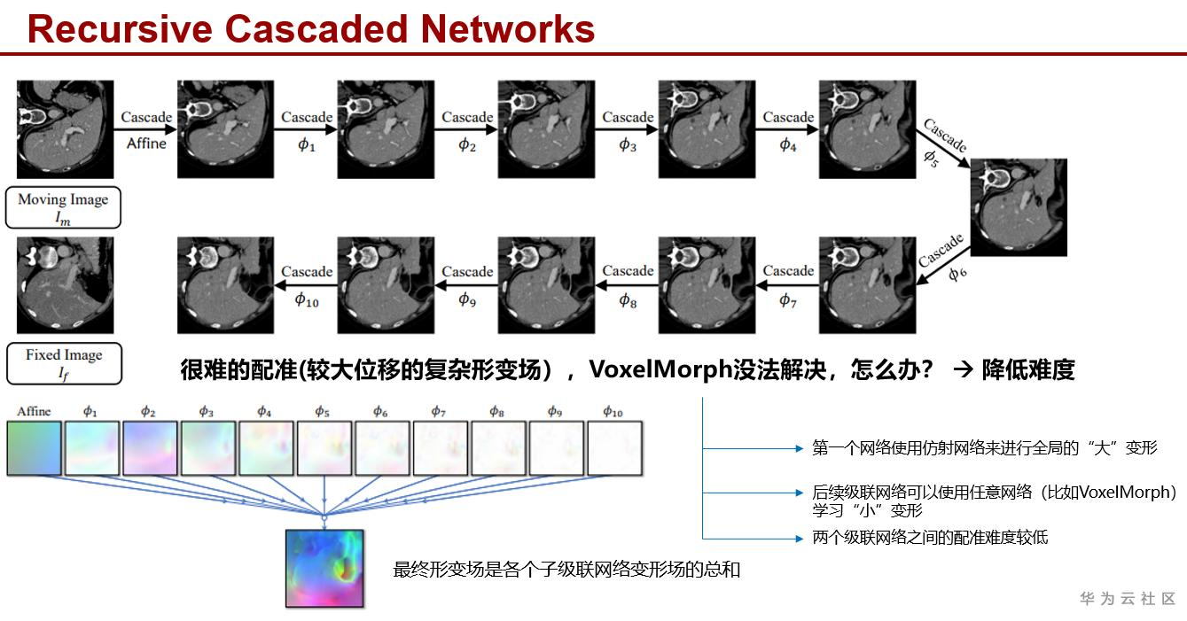 但在更复杂的存在较大位移的形变场的情况下,配准难度大大提高,Voxelmorph的效果不佳。此时就需要降低配准任务难度。Recursive cascaded networks通过级联递归的方式将一个难任务拆分为多个容易任务让Voxelmorph来配准,取得了不错的效果[3]。