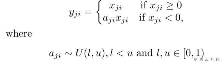 “随机纠正线性单元”RReLU也是Leaky ReLU的一个变体。在RReLU中,负值的斜率在训练中是随机的,在之后的测试中就变成了固定的了。RReLU的亮点在于,在训练环节中,aji是从一个均匀的分布U(I,u)中随机抽取的数值。形式上来说,我们能得到以下结果: