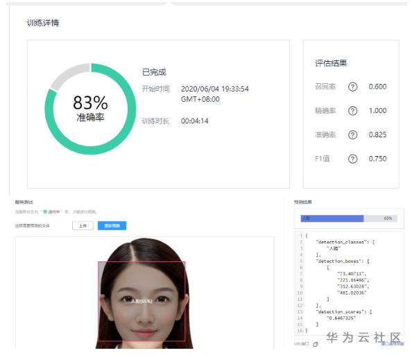 在标注好人脸位置后,可以一键训练部署,不需要进行任何的编程操作。在示例中,尽管只使用了12张人脸照片,但识别的准确率达到了83%,且预测所花费的时间在两秒以内,已经能够满足实际的使用需求。