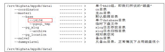 2) 进入该database目录,执行ll *.100,找出占用空间大的relation,若结果为空,则依次执行ll *.50,ll *.30,ll *.10,ll *.5,ll *.1等,查找占用空间大的对象;若无明显占用空间大的对象,或大小接近的对象数量非常多,则根据磁盘空间上涨的时间,查看最后更新时间与上涨时间接近的文件,确定relfilenode