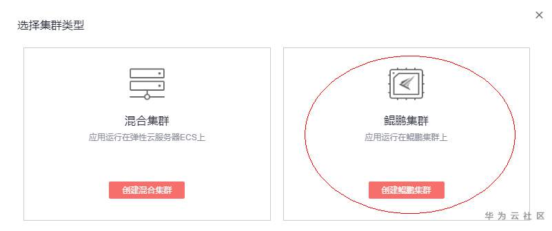 在左侧的基础设施页签下点集K8S集群(CCE)进入,Kubernetes集群管理页面,点击右上角创建Kubernetes集群以创建集群。在弹出的选择集群类型中按需求选择创建的环境类型,这里我们选择创建鲲鹏集群。