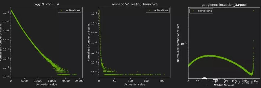 上图分别是vgg19-conv3_4, resnet152-res4b8_branch2a, googlenet:incetion_3a/pool的activations的分布直方图,其中横轴为activation值,纵轴是正则化后的值的数量级。