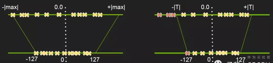 图右-saturation:选择一个阈值T,将范围T的FP32值映射至INT8,对于范围外的使用-127或128