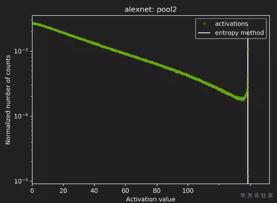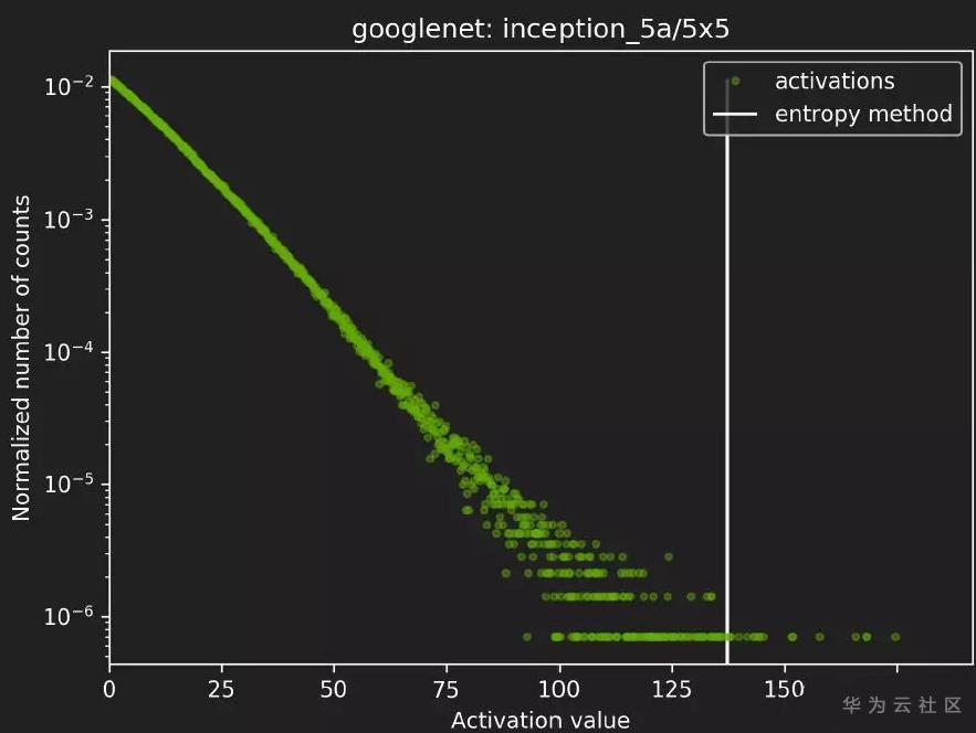 如上三图分别是GOOGLENET/ALEXNET/RESNET中某一层的activation的分布,其中白线的左边的activation数据将映射至INT8中,而右边的将被截断。