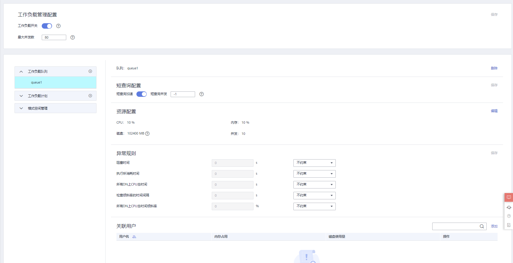 DWS负载管理页面主要包括工作负载管理配置区域、工作负载队列列表区域以及工作负载队列详情展示区域,工作负载管理配置用来管理工作负载功能的全局配置,包括工作负载开关和全局最大并发数的配置(每个CN的最大并发数);工作负载队列列表区域显示所有已创建的工作队列,可以在这里添加队列;队列详情区域包括队列的短查询配置、资源配置、异常规则配置以及队列中数据库用户的管理。