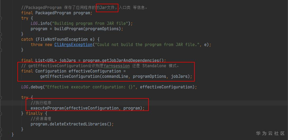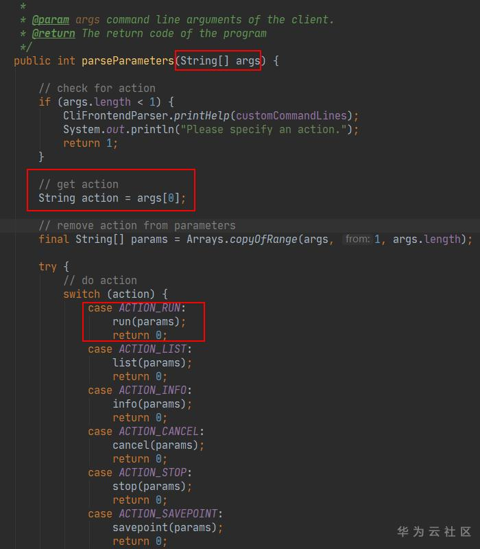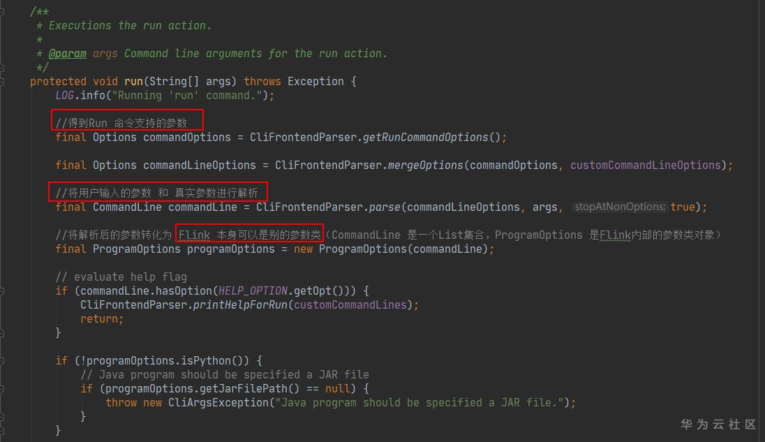 flink run命令方法的执行会 调用 run() 方法; prams 是 flink run 命令的参数。