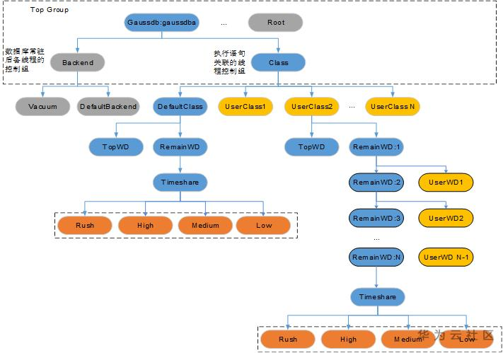 图中是控制组的一个挂载树,从最上层开始,就分为了两部分,一部分是属于Gaussdb的资源,一部分是留给系统其他进程使用的资源,我们使用的资源如图所示,都是挂载到Gaussdb:gaussdba的,其中第一层又分为两个控制组,Backend用来预留资源给数据库常驻的各个工作线程,Class控制组的资源用来分配给各个用户进行作业执行。