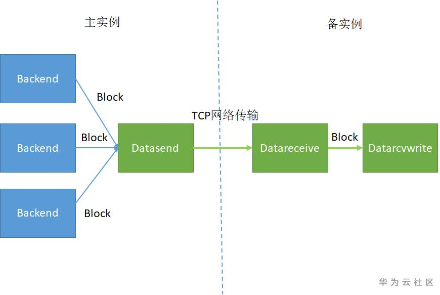 在数据导入过程中,每个业务线程Backend将收到的数据组成一个block(列存为一个CU)放到Datasend线程的数据队列(DataSenderQueue)里,Datasend线程将数据队列数据发送给Datareceive线程,Datareceive线程将接收的数据写入到数据队列(DataWriterQueue)中,Datarcvwrite线程从数据队列(DataWriterQueue)中取出数据按block分别写入到磁盘,实现主备复制高可用。