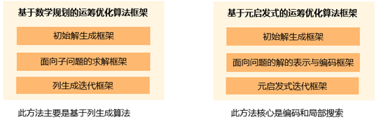 组合优化问题的常见求解算法是基于元启发式的和基于数学规划的运筹优化算法框架,策略如下: