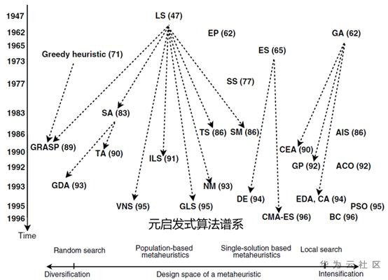 现有的元启发式顺丰种类极其繁多,文献【1】对经典的元启发式算法做了简单谱系分析,具体如下: