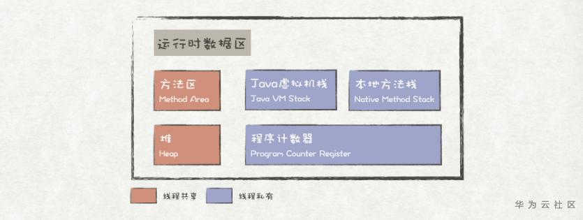 Java程序运行的过程中,JVM会将其所管理的内存划分成若干个区域,统称为是运行时数据区。其中,一些线程间共享的区域,随着JVM的启动而创建,JVM的退出而销毁;另一些线程私有的区域,则随着线程的开始而创建,线程的结束而销毁。如图所示,运行时数据区由以下几个区域所组成:程序计数器、Java虚拟机栈、本地方法栈、方法区、堆。