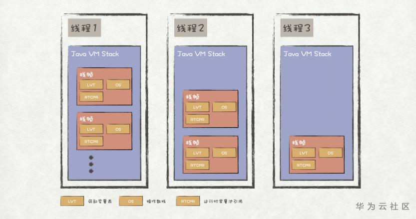 JVM会给每个线程都分配一个私有的内存空间,称为Java虚拟机栈(Java VM Stack)。Java虚拟机栈随着线程的创建而创建,它与传统语言(如C语言)的栈有着类似的作用,JVM只会对其执行两种操作:栈帧(Stack Frame)的入栈和出栈。也就是说,Java虚拟机栈是存储栈帧的后进先出队列(LIFO)。