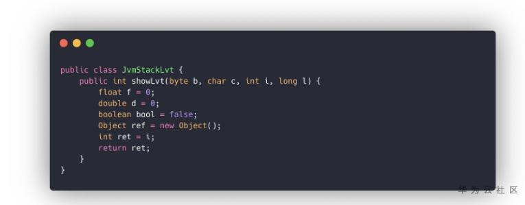 局部变量表(LVT) 是一个索引以0开始的字节数组,存储了一个方法的所有入参和局部变量。LVT所存储的类型都是编译期可知的,包括各基础类型(byte、char、short、int、long、float、double、boolean)、对象引用(reference类型)和returnAddress类型(指向一条字节码指令的地址)。