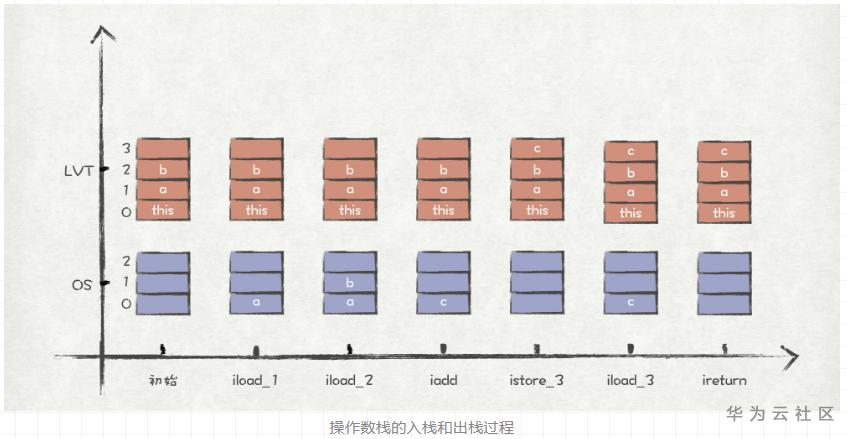 因为javap的输出结果中并不涉及操作数栈的内容,我们可以根据指令码和LVT来推断出OS的入栈和出栈过程,如图所示。