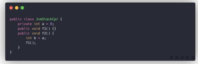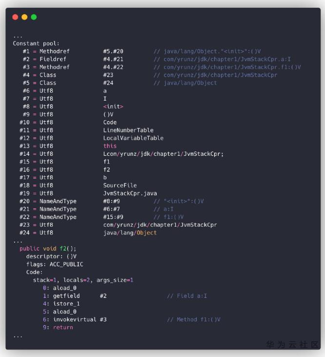 可以看出,f2()的指令码中,有两处使用了符号引用。getfield指令引用的符号为#2,最终解析成com/yrunz/jdk/chapter1/JvmStackCpr.a:I;invokevirtual指令引用的符号为#3,最终解析成com/yrunz/jdk/chapter1/JvmStackCpr.f1:()V。
