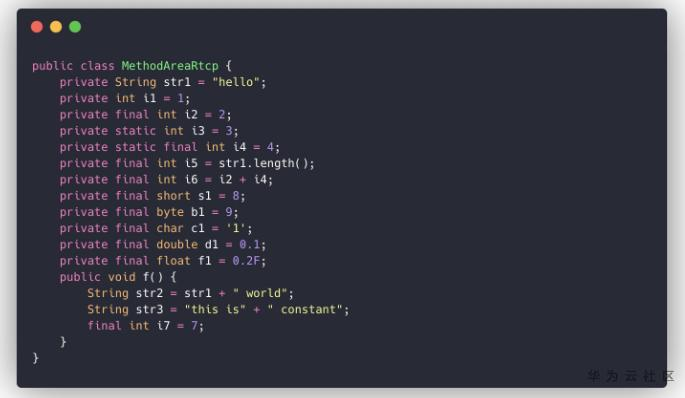 2、用final修饰的基础类型成员变量的字面值。注意,必须是用final修饰的,而且必须是类的成员变量的字面值才会被编译器添加到常量池中,如i2的值2在常量池中的位置为#32。i5虽然是用final修饰的基础类型成员变量,但是它的值5是运行时函数调用的结果,因此并未出现在常量池中;i7虽然是被final修饰,但是它本身是一个局部变量,因此它的值7并未出现在常量池中。