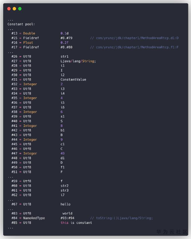 由结果可知,class常量池信息中包含了MethodAreaRtcp类所有的符号引用和编译期可知的字面值常量。