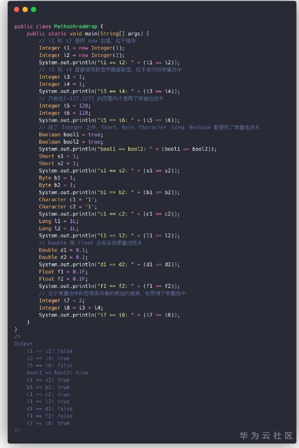 2、基础类型的包装类也用到了常量池技术。Java的部分基础类型的包装类(Character、Byte、Short、Integer、Long、Boolean)也用到了常量池技术,当使用数值字面值给它们赋值时,它们就会被存储到运行时常量池中。此外,位于运行时常量池中的包装类相加得到的结果,也会被存储在常量池中。值得注意的是,只有在 [-127, 127] 的范围内,包装类才会使用到常量池技术,超过该范围的还是会在堆中存储。以下例子验证了这些特点: