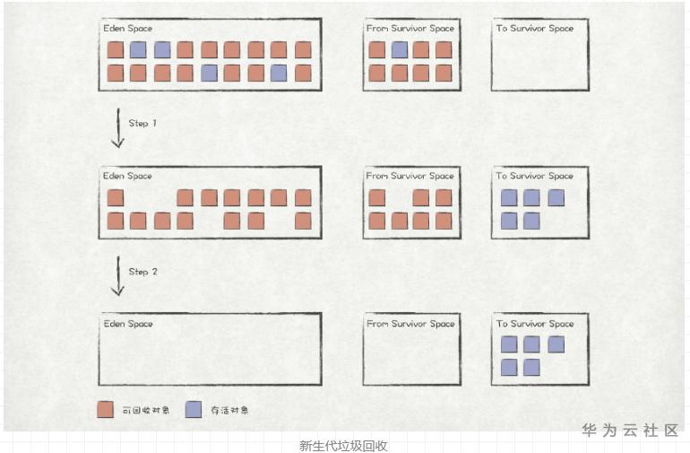 新生代几乎是所有对象诞生的地方,这个区域上的对象有生命周期短的特点,来的快,去的也快。垃圾收集器每次对该区域进行回收时,通常都会有大量的对象被回收。新生代上都是些 “小” 对象,而且存活率低,进而复制成本较低,因此通常采用复制算法进行垃圾回收。如图所示,进行回收时,垃圾收集器会将Eden Space和From Survivor Space中存活的对象复制到To Survivor Space中,然后将前两个区域清空。当下次回收的时机到来时,则将Eden Space和To Survivor Space中存活的对象复制到From Survivor Space上,然后将前两个区域清空,依次交替进行。
