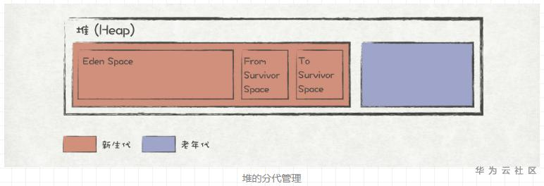 JVM对堆进行了分代管理,分成新生代(Young Generation)和老年代(Old Generation),其中新生代中又分为Eden Space、From Survivor Space、To Survivor Space三个区域,如图所示。