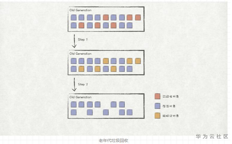 如果位于新生代中的对象经过几轮垃圾回收都存活了下来,JVM就会将这些对象转存到老年代中;另外,一些 “大” 对象创建时,如果新生代没有足够的空闲内存,JVM也会在老年代中为其分配内存。因此,老年代中的对象通常都是些生命周期较长或者占用空间较大的对象,其复制成本较大,因而垃圾收集器通常采用标记-清除算法进行垃圾回收。如图所示,进行回收时,垃圾收集器会对可回收的对象进行标记,然后直接清除。
