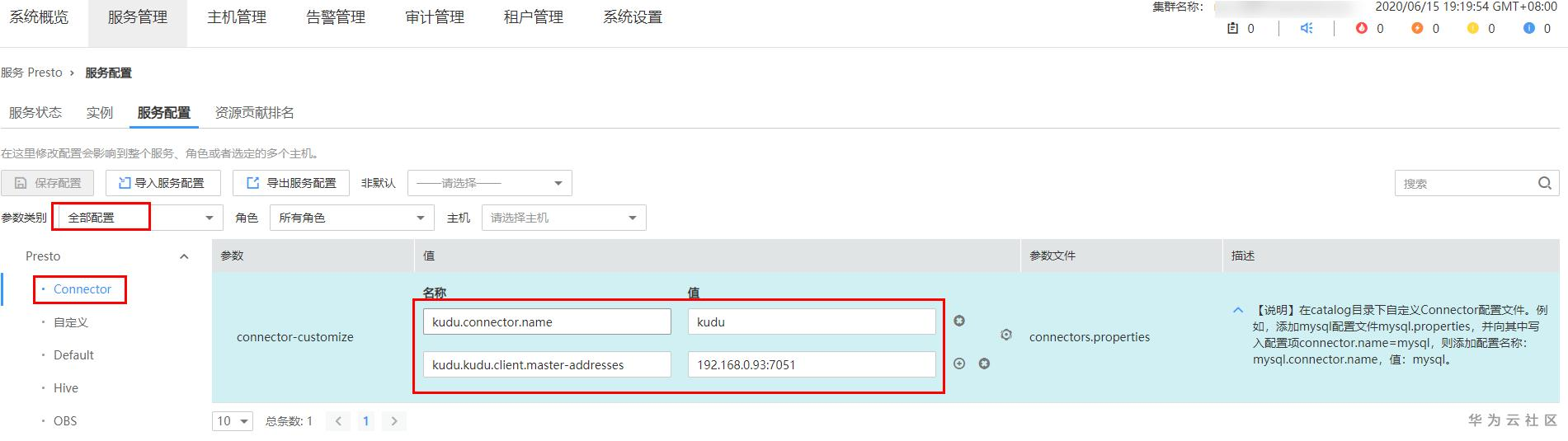 打开集群A的MRS Manager页面,在Presto>服务配置中添加配置项kudu.kudu.client.master-addresses和kudu.connector.name后点击“保存配置”并选择重启服务。