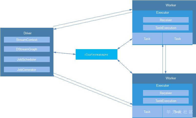 SparkStreaming 和 Spark批处理一样,有Driver、Executor、clustermanager(本文不讲)、worker等基本概念。后面的内容会介绍这些组件里的细节。