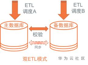 即采用两套独立调度平台进行数据加工,抽取同一个数据源(往往是落地稳定的数据交换平台),采用同一套ETL代码依赖逻辑调度,各自生成目标数据,往往批量过程中,采取主库对外持续服务,待主备库数据准实时或批后校验一致后,再开放备库对外服务。