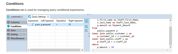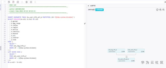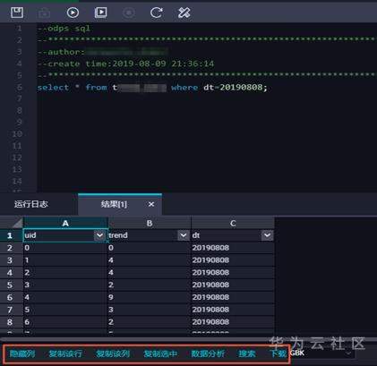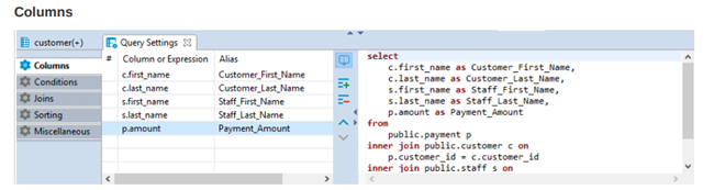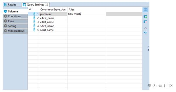 提供强大的图形化界面为用户自动生成SQL。用户可以通过图形界面增删改columns,设置where条件子句,进行多表JOIN,排序等常用操作,对应的SQL语句将会自动生成。图形化界面将大大降低用户的使用门槛,即使对SQL语句不熟悉,也可以流畅的写出SQL脚本。