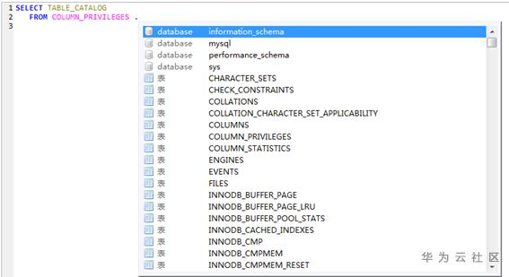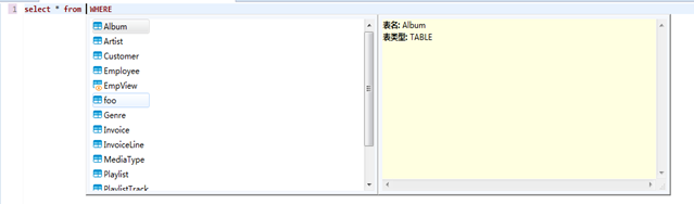 2. 智能提示有两个框,右边的框会展示更多详情,比如表中某一列的数据类型,长度,是否自动递增等基本定义。