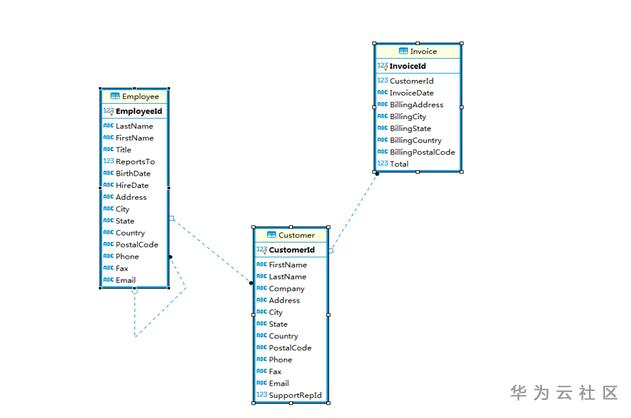 5. 提供ER图,想操作哪些表,同样可以通过拖拽的方式,拖到右侧的画布中,表之间的虚线代表foreign key,可以通过界面新增foreign key。