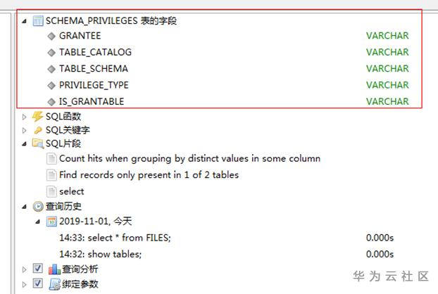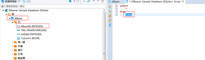 4. 表名和列名都有drag-and-drop的功能,从左侧导航栏直接拖拽到编辑器中即可显示表名或者列名,不需要手动输入,对于名字比较复杂的表来说操作更方便。