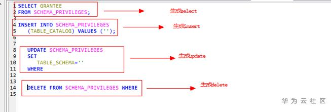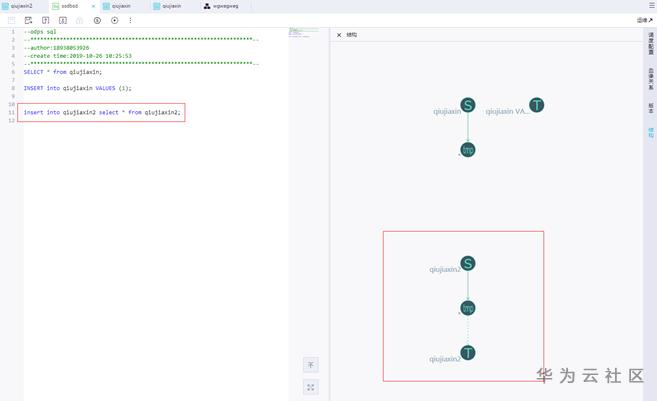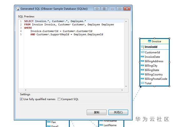 可以根据ER关系图自动生成SQL语句,下图中的语句是JOIN语句。此功能在进行多表查询等比较复杂的操作时很方便,不需要用户手动去敲,也避免了手动敲可能出错的问题。