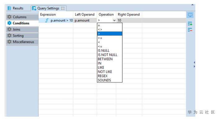 3. 结果展示面板,允许用户使用SQL表达式直接对结果集进一步过滤